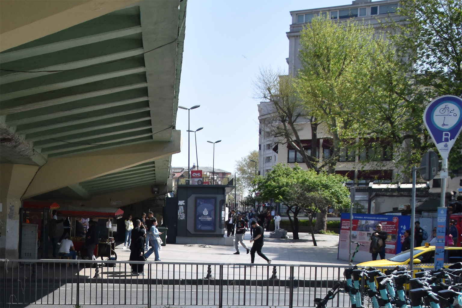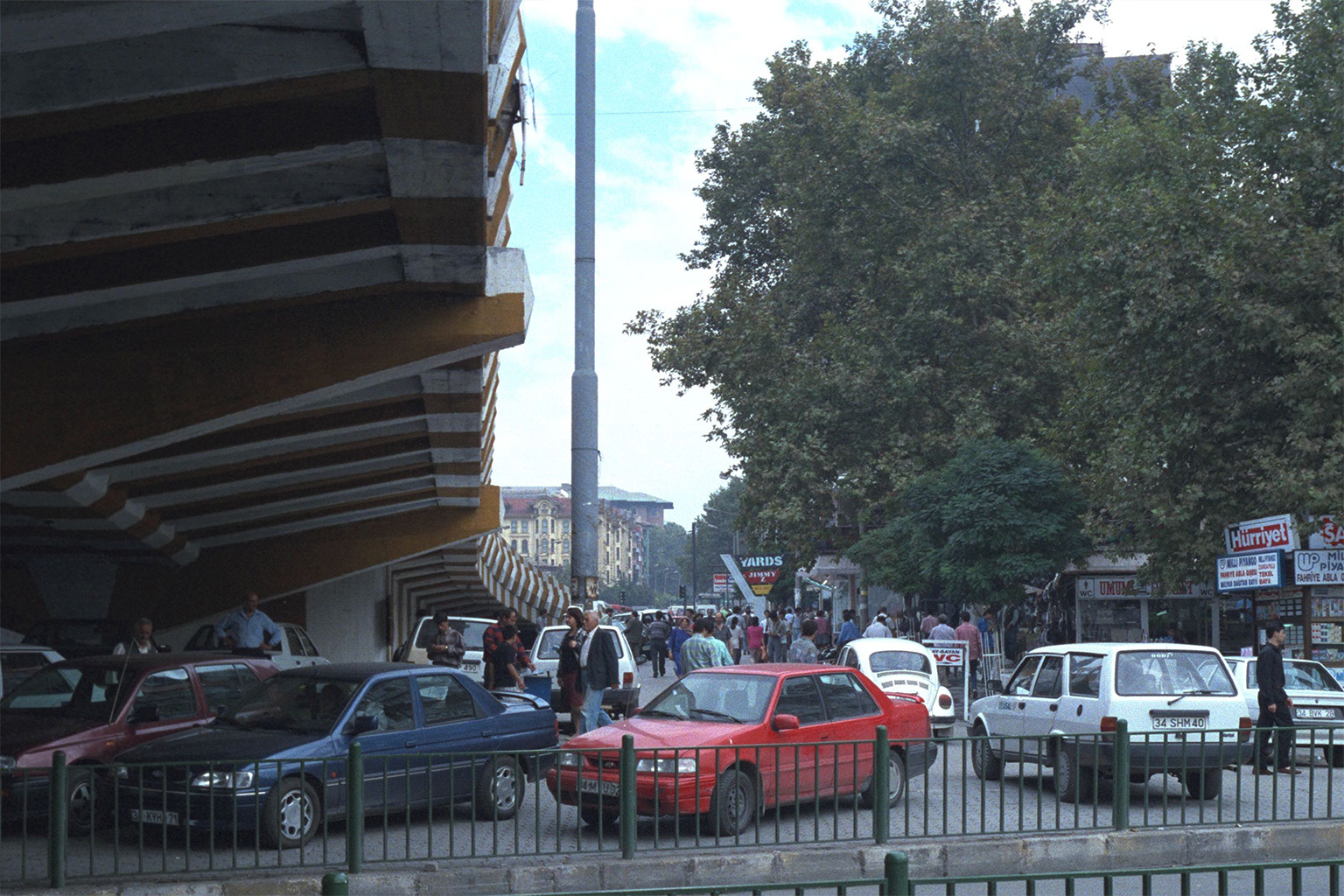 Image 4 of the Istanbul Revisit series is on the way to Ordu Cadesi just off the tram stop Aksary. Istanbul28Y04 Aksaray. We are half under the bridge and the tram stop is on the left where you see people walking to and from. The yellow/white of the 1996 bridge is replaced by a lighter shade yellow and green. In 1996 this was more parking lot than a square. Next to the bridge we also see the top of the building that is as it was 28 years ago. In the distance we even see the roof matching one of the buildings further down the street. The scale here is a bit off as the cars of the old picture are not in scale to the people of 2024. This is clearly visible in the red and blue cars in the front.