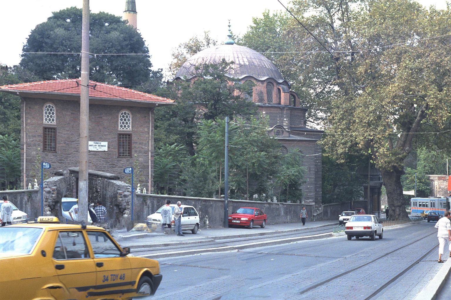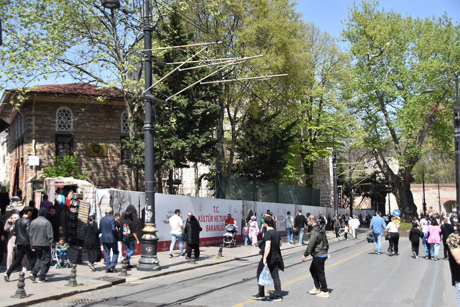 On image 8 of the Istanbul Revisit series we are still on Alemar Caddesi. Images 7, 8 and 9 are closely related and share multiple visual markers. Here we are on our way to Gühlhane Park (Image 9). Istanbul28Y08 Zeynep Sultan Camii. The remarkable tree from Image 7 is on the right and a sliver of the rainbow gate of 1996 is visible on the right edge. The dome of the Zeynep Sultan mosque is floating in the image, clearly visible in 1996 it is now engulfed in trees and construction fences. The pedestrians have taken over this busy street in 2024, the two-way street has been blocked for regular cars. The 1996 image has been slightly updated/altered to fit the 2024 image.