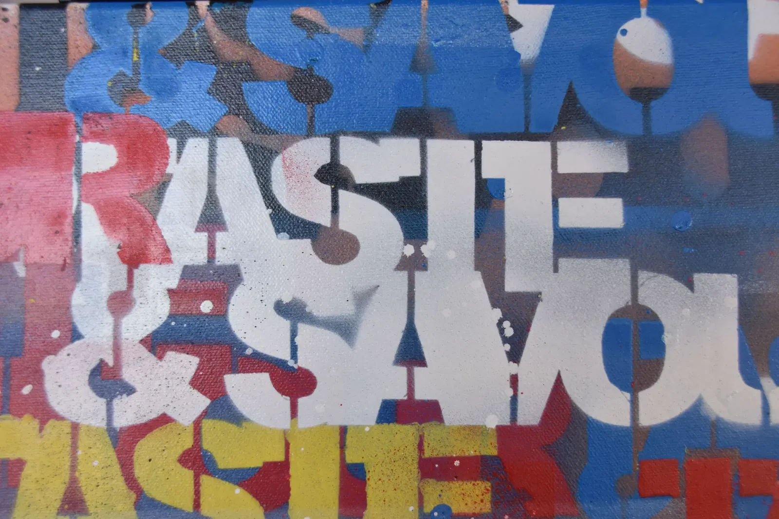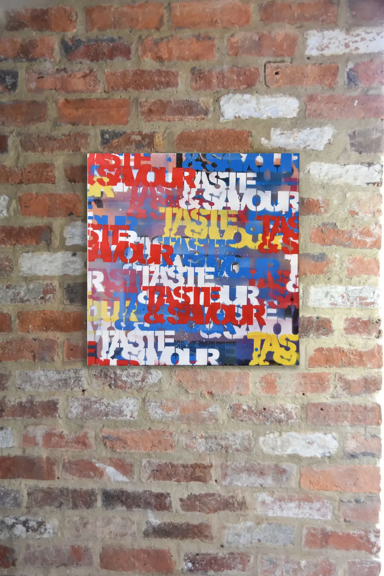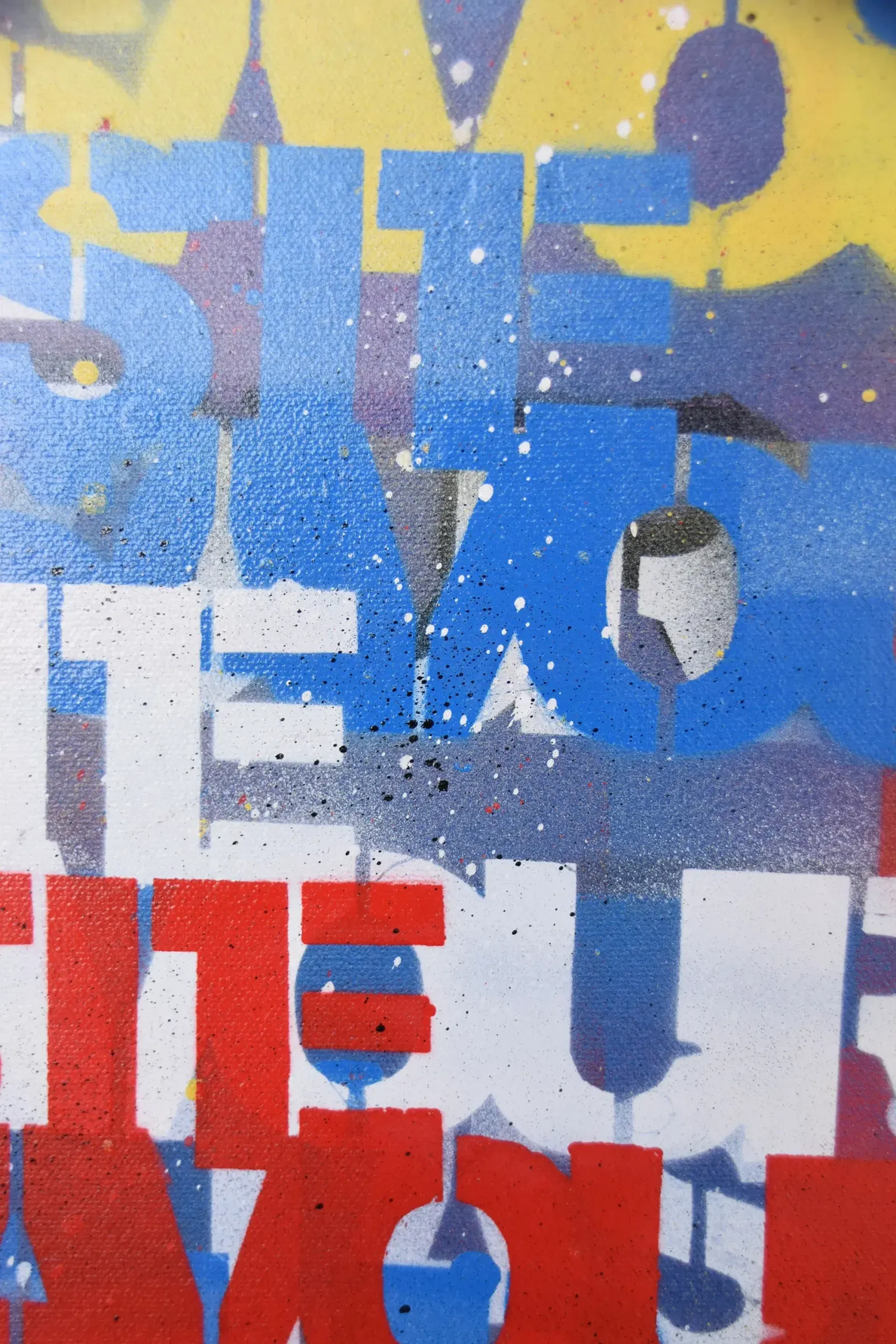 This artwork translates that experience into a contemporary conceptual canvas. Loud, basic colours reference the raw immediacy of street graffiti, while layered forms echo the way meaning can become obscured through excess. As with the streets of Exarcheia itself, the viewer is invited to search actively for the message rather than consume it passively.
