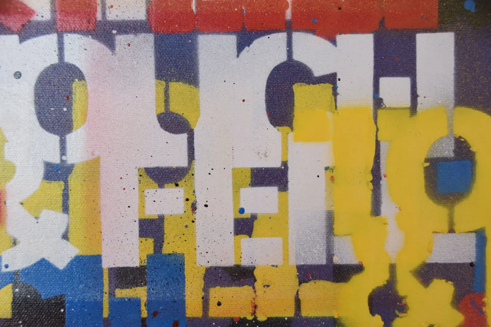 This artwork translates that experience into a contemporary conceptual canvas. Loud, basic colours reference the raw immediacy of street graffiti, while layered forms echo the way meaning can become obscured through excess. As with the streets of Exarcheia itself, the viewer is invited to search actively for the message rather than consume it passively.
