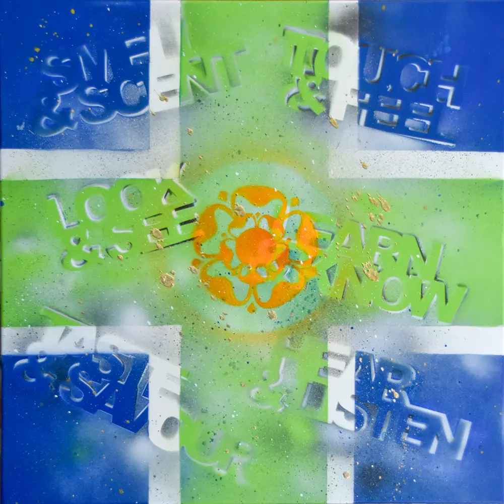 During my stay in Derbyshire in the summer of 2025 I decided to make a graffiti style work that had a relationship to the place I was in. This became the Derbyshire and Derbyshire2. As I was also in the UK I used the Union Jack to make a canvas that reflects on the British Empire, This started a small series where I make works that are made on the location they refer to. Examples are Cologne 1 & 2, Hopton Hall and a number of smaller works.